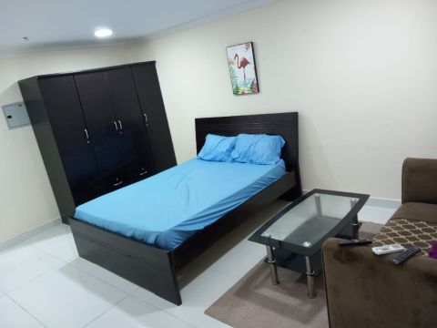 Monthly rent in Ajman, Al Yasmeen Towers, opposite Ajman City Center, furnished studio, clean furniture, large area, central air conditioning, separate kitchen, price 3200, including bill, electricity, water, sewage, and internet, all services are available, excellent location, easy exit, Mohammed Bin Zayed City