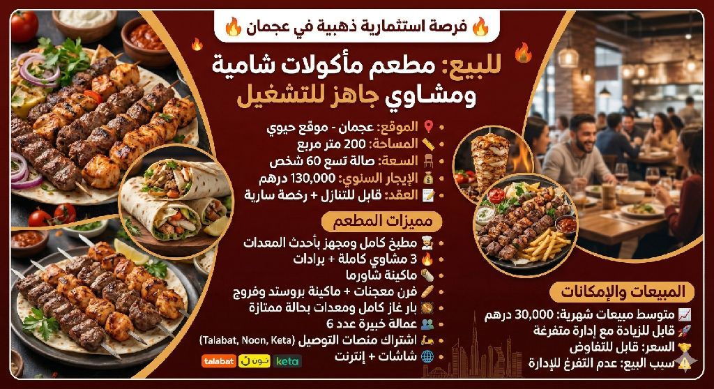 Investment Opportunity - Ready - to - Operate Restaurant in Ajman Levantine Cuisine & Grill Restaurant for sale Area 200 SQM Capacity 60 people - 14 tables Annual rent AED130000 Transferable Lease Agreement Valid License - No Violations Fully Equipped and Ready to Operate Complete Kitchen 3 Complete Grills with Refrigerator Shawarma Machine 2 Freezers Pastry Oven Broasted Chicken Mach