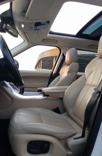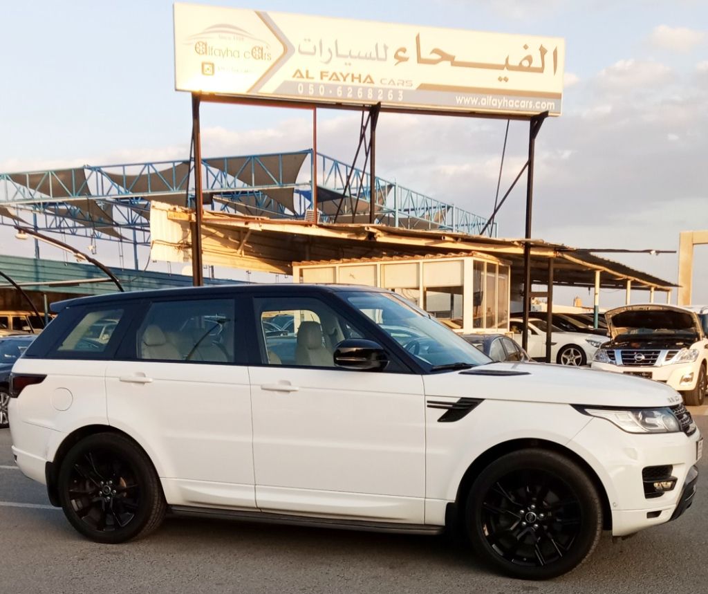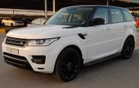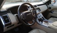 Range Rover Sport HSE 6-cylinder 3.0L full option model 2014. Price 80,000 AED. Odometer 175,000 km. Gulf specifications. Exterior color white, interior color beige. Features include front 12V socket only, ambient lighting, steering wheel audio controls, automatic dimming mirror, automatic air conditioning, AUX input, Bluetooth, laser disc (CD) player, speed control with steering wheel buttons, computer showing distance, fuel, and average speed.