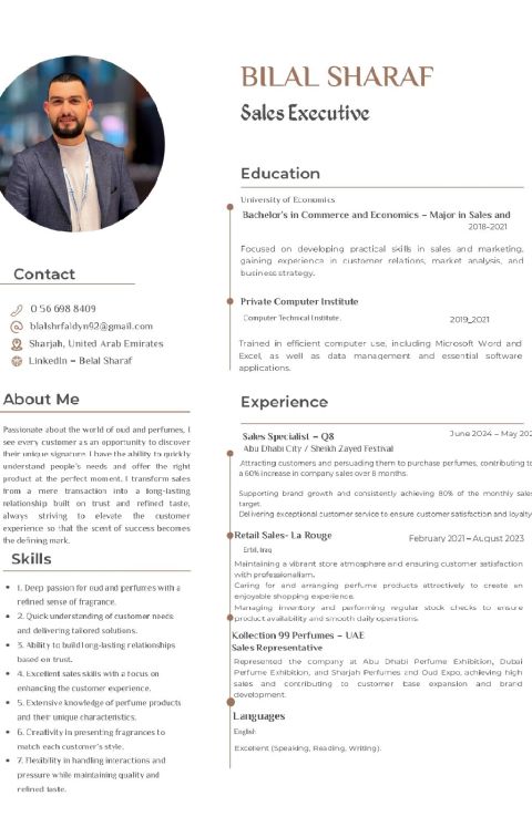 خبير مبيعات عطور فري لانسر بخبرة مميزة في تسويق وبيع العطور الشرقية والغربية، أتمتع بحس فني في اختيار وتنسيق الروائح وقدرة عالية على جذب العملاء بأسلوب راق ومقنع. عملت في معارض عطور داخل الامارات وحققت نتائج مبهرة في المبيعات، متواجد في دبي ومستعد للتعاون بمعارض وشركات العطور في جميع الامارات