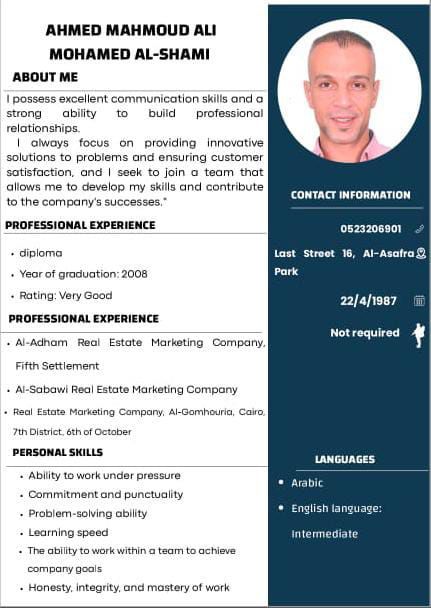 أنا أحمد الشامي من مصر محتاج شغل في العقارات خبرة في مصر 10 سنوات