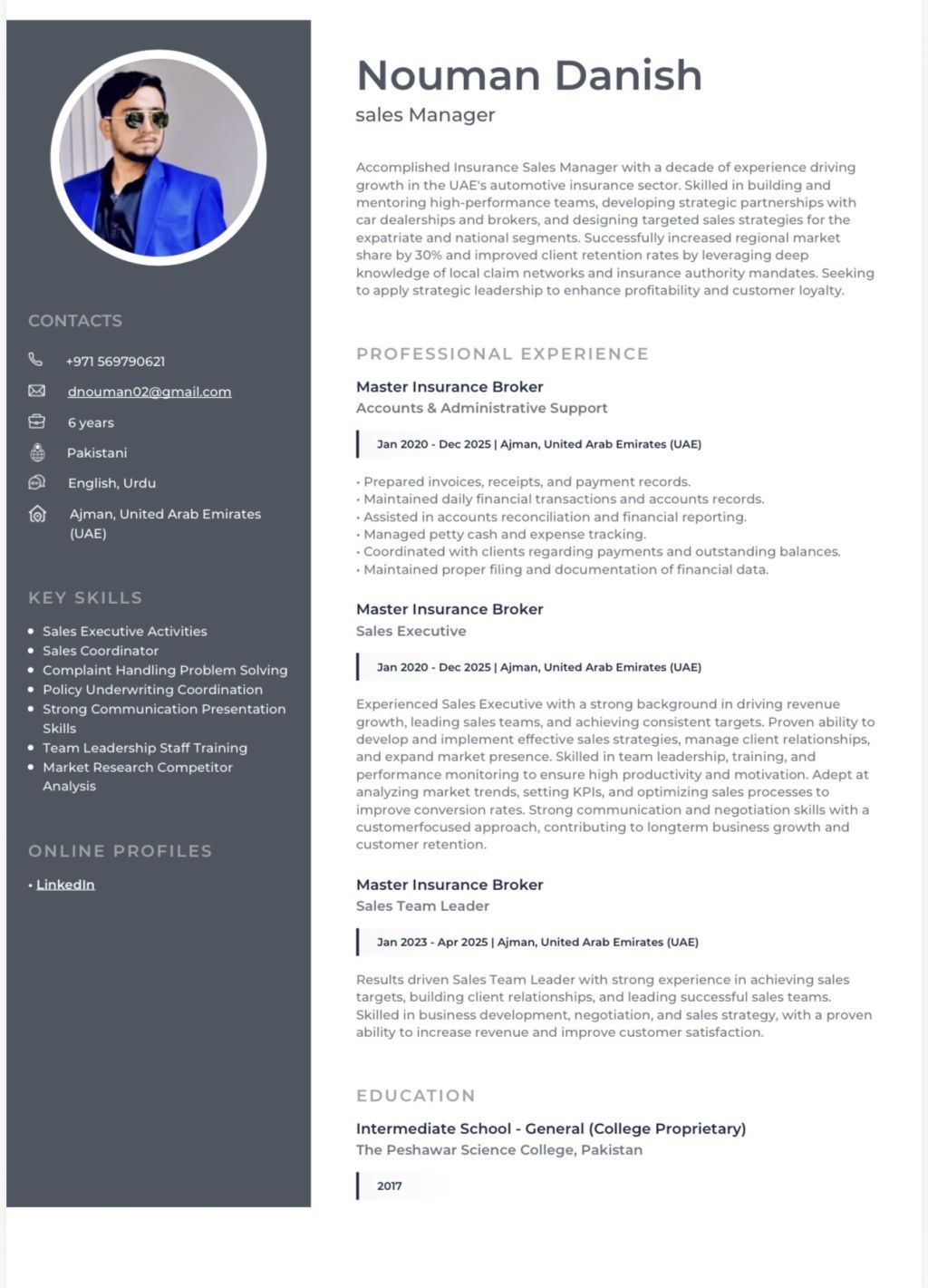 ابحث حاليا عن فرصة عمل في الامارات العربية المتحدة. أعيش هنا منذ سبع سنوات، ولدي خبرة واسعة في مجال المبيعات. أنا شخص طموح وموهوب، قادر على التعلم السريع والتكيف مع الأدوار والبيئات الجديدة. ابحث حاليا عن فرص عمل في عجمان أو الشارقة أو دبي. اذا كانت هناك أي وظائف شاغرة مناسبة أو عاجلة، فأرجو ابلاغي