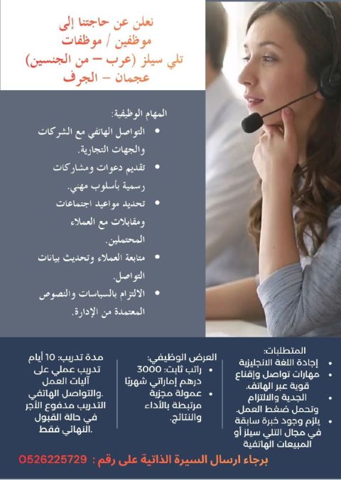 نعلن عن حاجتنا الى موظفين تلي سيلز براتب 3000 درهم وعمولة مجزية للعمل في مجال الاعلام والتلفزيون كما نرغب في مشرف مبيعات تلي سيلز يمتلك رخصة قيادة براتب مجزي موقعنا عجمان الجرف