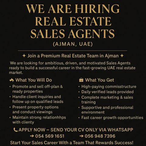 وكلاء مبيعات عقارية (عجمان الياسمين، الامارات العربية المتحدة) انضم الى فريق عقاري مميز في عجمان نحن نبحث عن وكلاء مبيعات طموحين، مجتهدين، وذوي دافع قوي، جاهزين لبناء مسيرة مهنية ناجحة في سوق العقارات سريع النمو في دولة الامارات. ما الذي ستقوم به الترويج وبيع العقارات الجاهزة وتحت الانشاء التعامل مع استفسارات العملاء ومتابعة العملاء المؤهلين عرض خيارات العقارات وتنظيم الجو