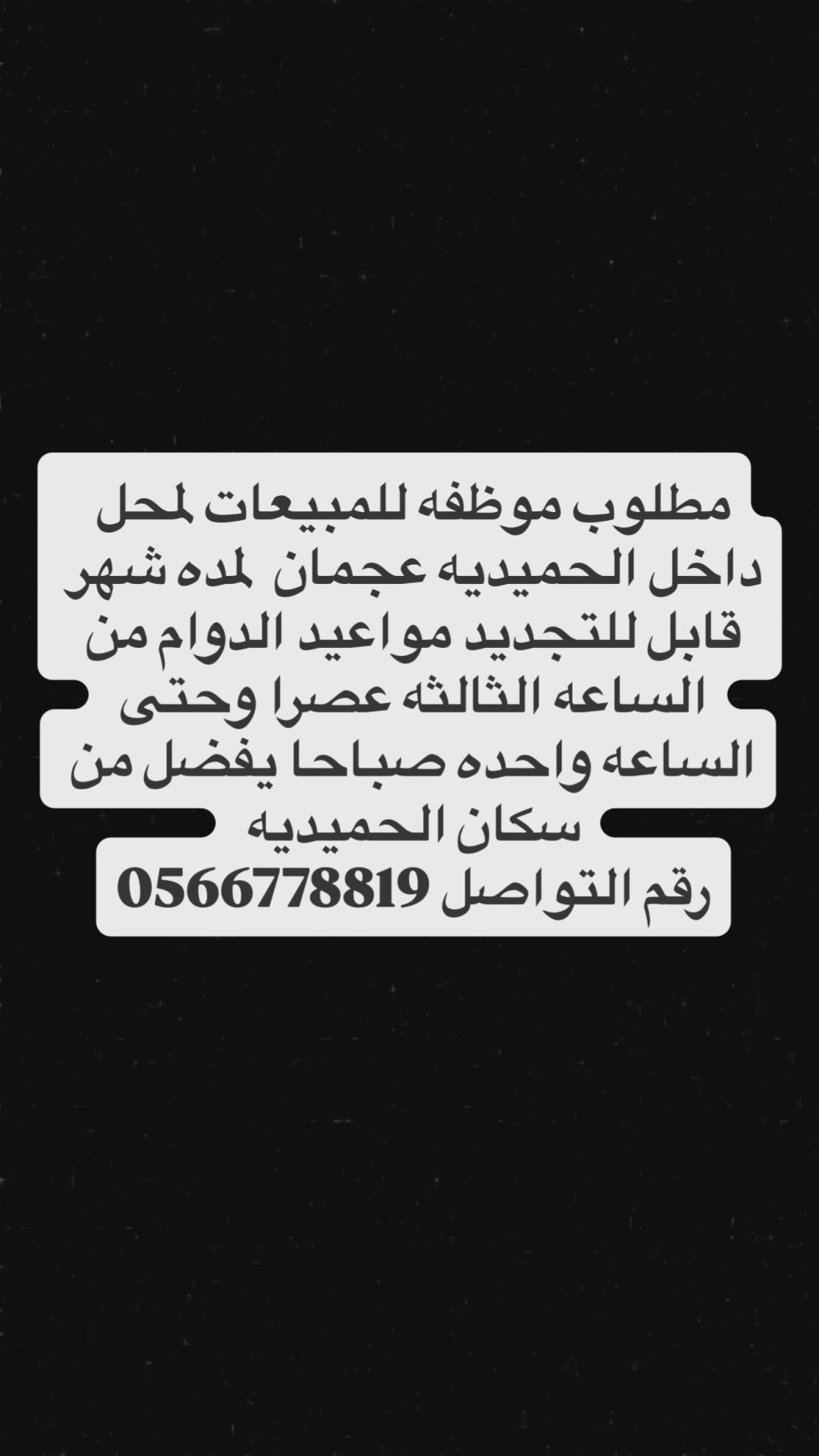 مطلوب شاب أو فتاة مبيعات في محل في عجمان الحميدية لمدة شهر قابل للتجديد يفضل من سكان الحميدية