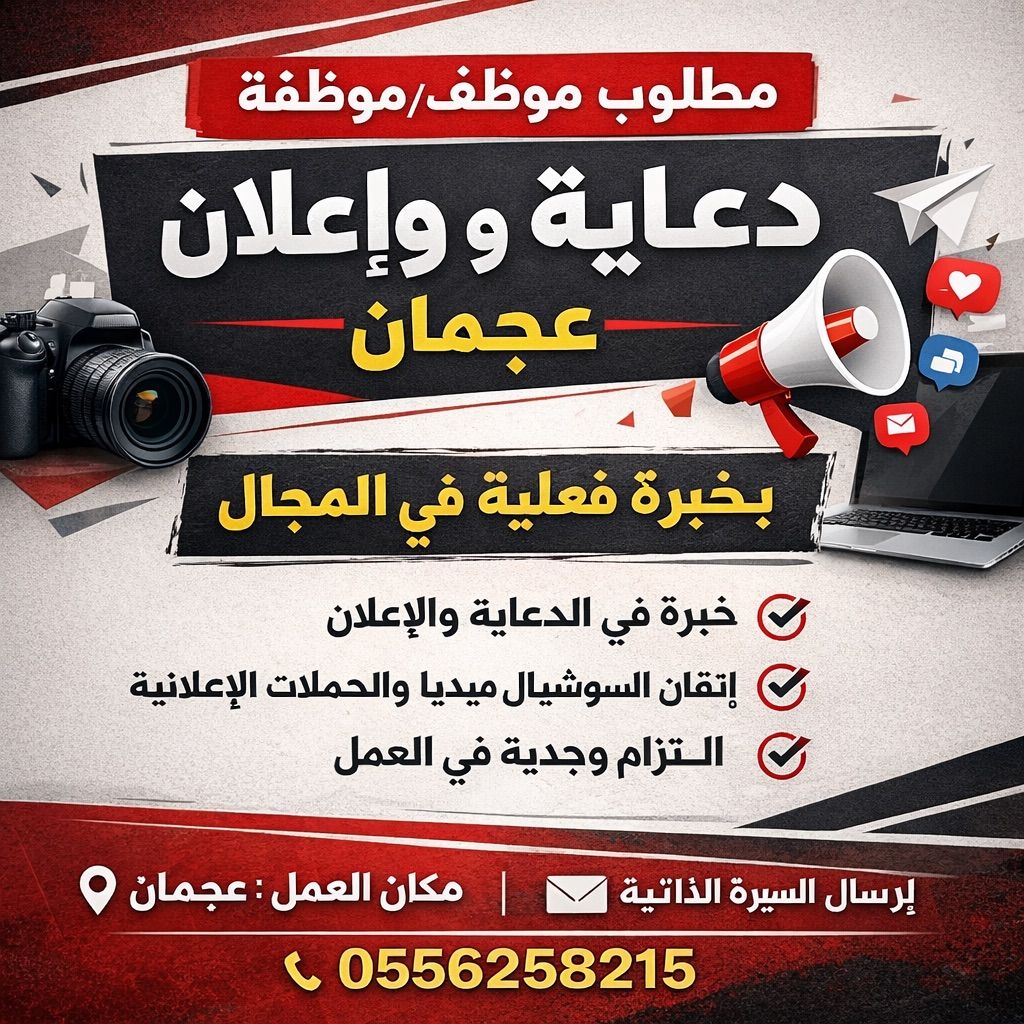مطلوب موظف أو موظفة للعمل في شركة دعاية واعلان في عجمان قيد الافتتاح المطلوب خبرة في مجال الدعاية والاعلان والتواصل مع العملاء الراتب يحدد بعد المقابلة
