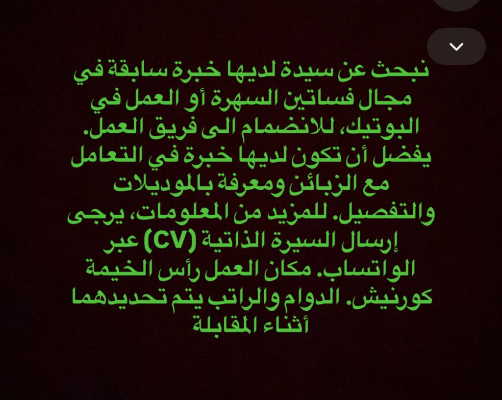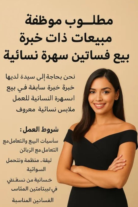 مطلوب موظفة مبيعات ذات خبرة - محل بيع فساتين سهرة نسائية نحن بحاجة الى سيدة لديها خبرة سابقة في بيع فساتين السهرة النسائية للعمل في محل ملابس نسائية معروف. بأساسيات البيع والتعامل مع الزبائن لبقة، منظمة وتتحمل المسؤولية - خبرة سابقة في محلات بيع الملابس النسائية - القدرة على مساعدة الزبونات في اختيار الفساتين المناسبة المكان الكورنيش رأس الخيمة