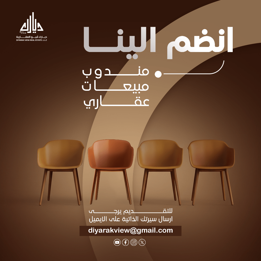 شركة ديارك فيوالعقارية تفتح باب الانضمام الى فريقها أمام الشباب والبنات الطموحين أصحاب الأهداف والطموح العالي للعمل في مجال الوساطة العقارية الراشدية 1 - شارع خليفة بن زايد بيئة عمل احترافية ومحفزة حملات تسويقية قوية تدعمك في النجاح عمولات مجزية + بونصف وحوافز تشجيعية فرص حقيقية للنمو والتطور المهني المؤهلات المطلوبة مهارات تواصل واقناع عالية القدرة على الحوار وبناء علاقات مع العملاء الطموح والسعي