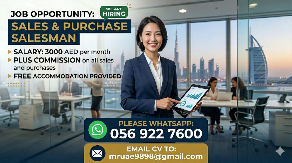 Sales and purchase salesman Salary AED3000 Accomodations free Please what's up