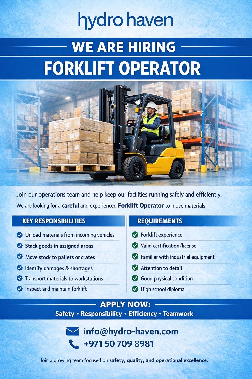 Requirem - Proven experience as forklift operator - Attention to detail and familiarity with Industrial equipment - Excellent physical condition and coordination - Valid certification to operate forklifts - High school diploma