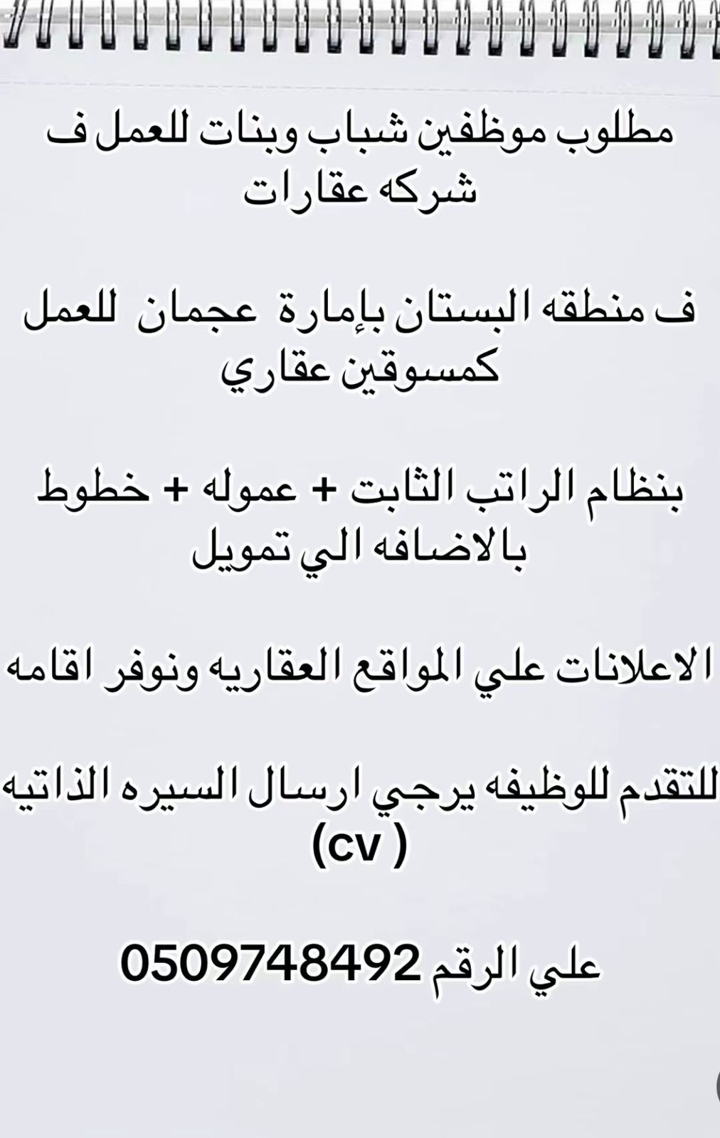 Young men and women are needed to work as real estate marketers in a real estate company in Al Bustan area, Ajman. The position offers a fixed salary, commission, mobile phone allowance, and advertising funding for real estate websites. Accommodation is provided. To apply, please send your CV to