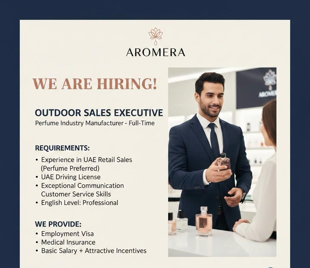 Aromera Hiring Outdoor Sales Role Perfume in Ajman. employment type (full time) Requirements UAE Retail Exp (Perfumes preferred) UAE Driving License - Professional English and Arabic - Strong Comm Skills We Offer Basic Salary + Incentives - Employment Visa - Medical Insurance Apply Now Send your CV to