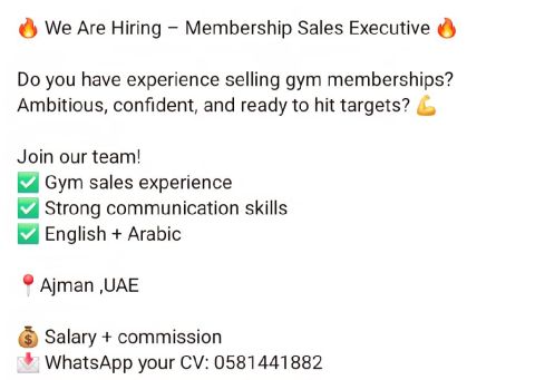 We Are Hiring - Membership Sales Executive (Male or Female) Do you have experience selling gym memberships Ambitious, confident, and ready to hit targets Join our team Gym sales experience Strong communication skills. English + Arabic. Ajman UAE. Salary + commission WhatsApp your CV. Ajman, Alnakhel
