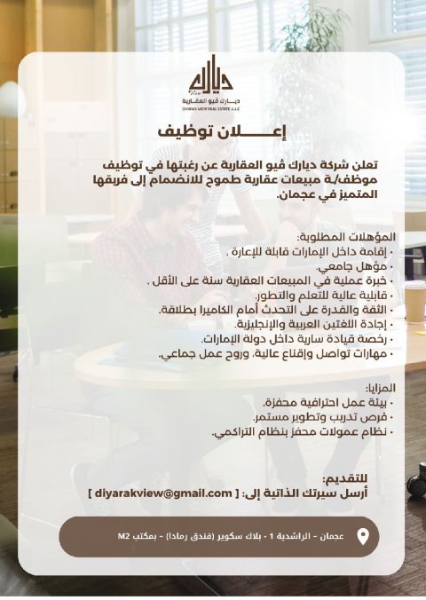 Opportunity for real estate Sales Staff - Rashidiya 1 Black Square Ajman Diyarak View real estate announces an opportunity for real estate Sales Staff to join its distinguished team in the Emirate of Ajman