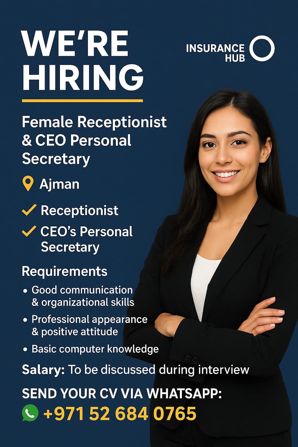 We’ re Hiring - Female Receptionist & CEO Personal Secretary Location Ajman Company Insurance Hub We are looking for a Smart, confident, and presentable female candidate to join our office as Receptionist CEO’s Personal Secretary Requirements Good communication & organizational skills Professional appearance & positive attitude Basic computer knowledge Salary To be discussed during interview Send