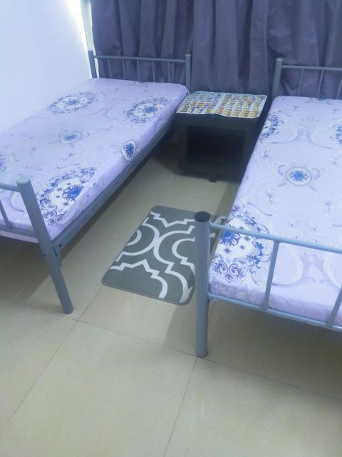 2 beds available for male employees at AED600 in a new apartment near Grand Mall. The apartment is clean, organized, quiet, and close to the bus stop
