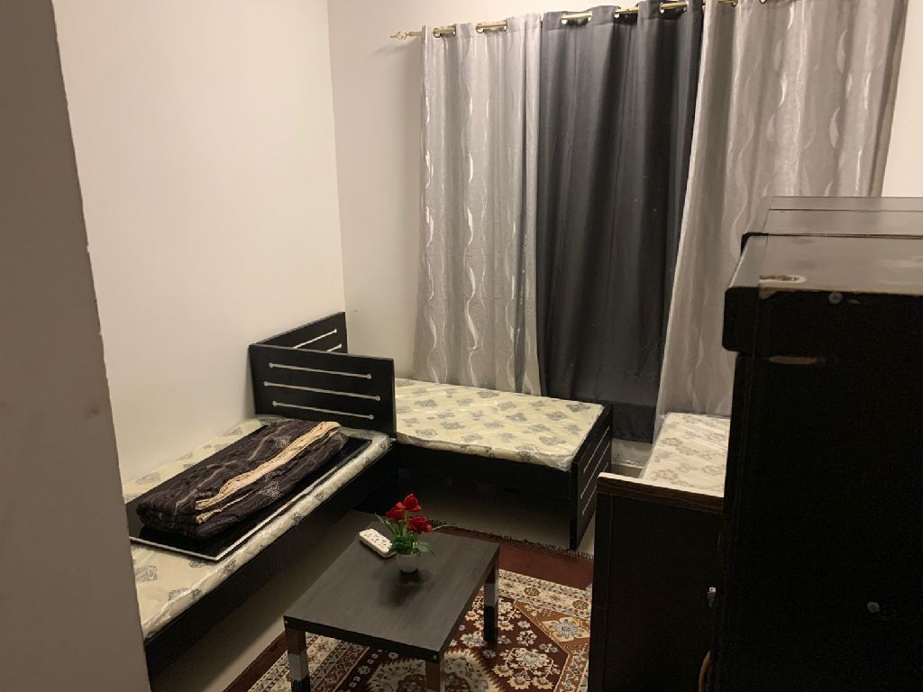 Single beds are available in a master room for males at AED650 in Al Lou Loua Towers, Rashidiya 1. The apartment is brand new with new furniture, clean, quiet, and close to all services