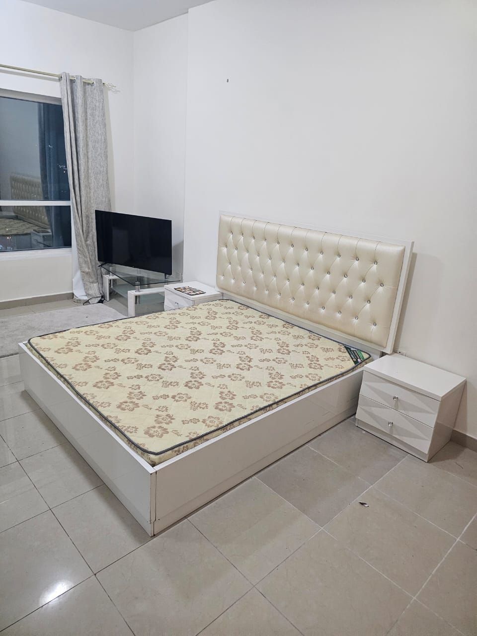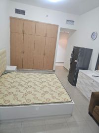 A spacious master bedroom with an ensuite bathroom, TV, and refrigerator, located on Ajman Corniche, Al Nakheel 2, first row from the Corniche. Suitable for a couple, a young man, or two young men. Price AED2400