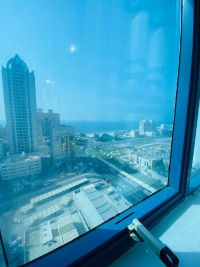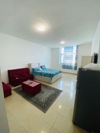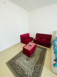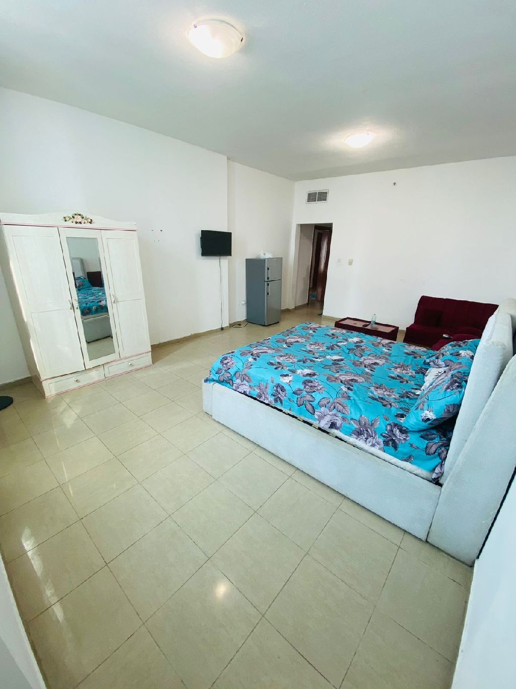 A spacious master bedroom with an ensuite bathroom, TV, and refrigerator, located on the Ajman Corniche, second row from the Corniche, with a sea view. Suitable for families, a couple, or one or two daughters. Price AED2200