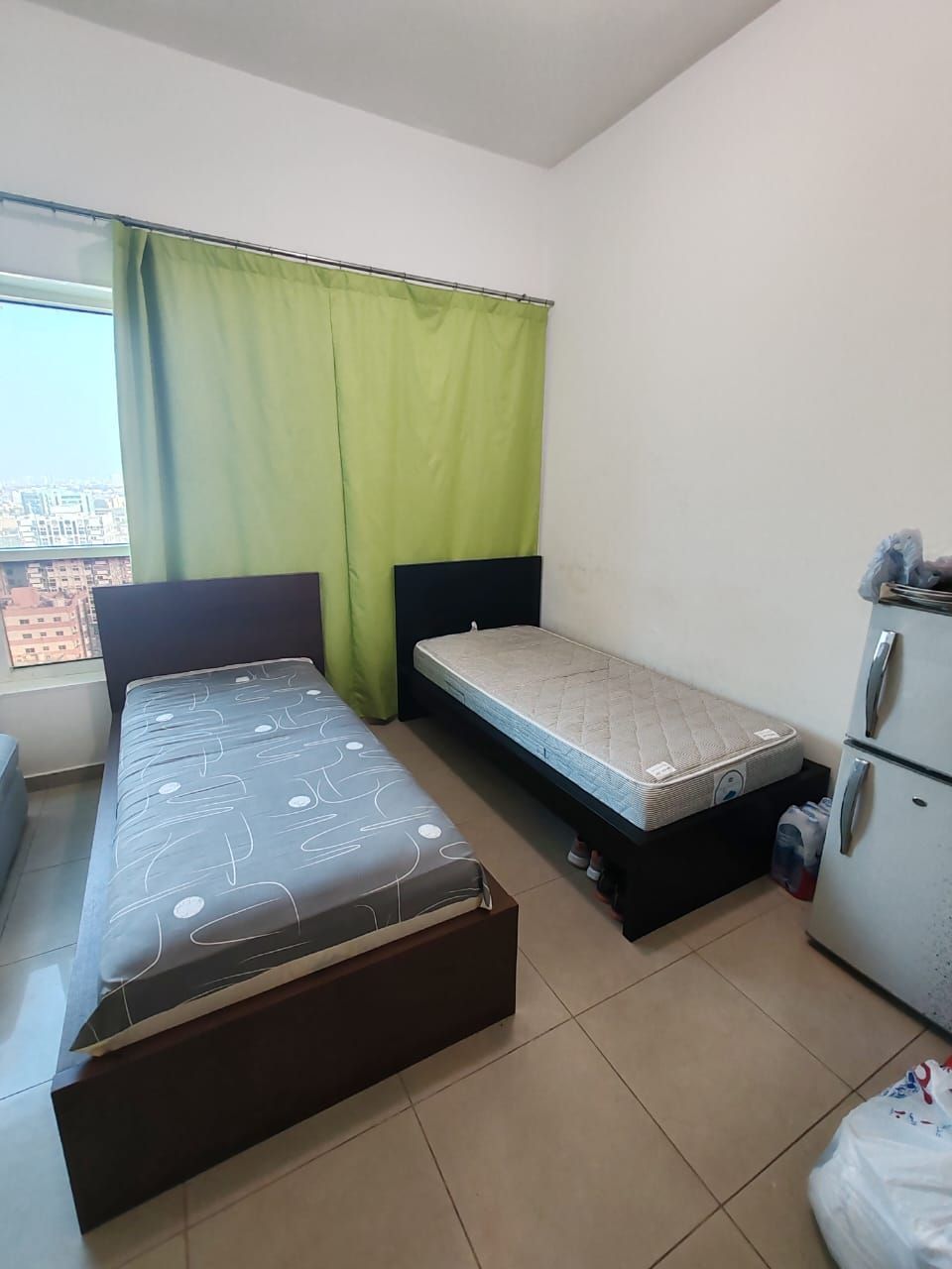 Master bedroom with private bathroom, TV, and refrigerator in Ajman Corniche, first row from the Corniche, for two young men in a youth hostel. Price AED2400