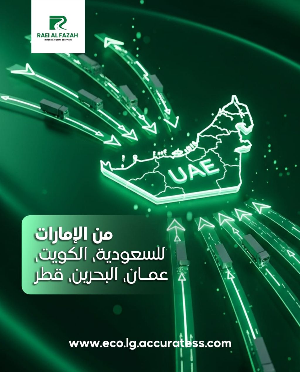 Raie Al Fazaa International Shipping Smart shipping solutions from the UAE to all over the world We provide you with comprehensive international shipping services at competitive prices and reliable service you can trust. We cover shipping from the UAE to GCC countries European countries All Arab countries What makes Raie Al Fazaa stand out Competitive prices suitable for individuals and traders Fast