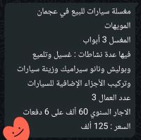 مغسلة سيارات للبيع في عجمان المويهات المغسل 3 أبواب فيها عدة نشاطات غسيل وتلميع وبوليش ونانو سيراميك وزينة سيارات وتركيب الأجزاء الاضافية للسيارات عدد العمال 3 الإيجار السنوي 60 ألف على 6 دفعات السعر 125 ألف درهم