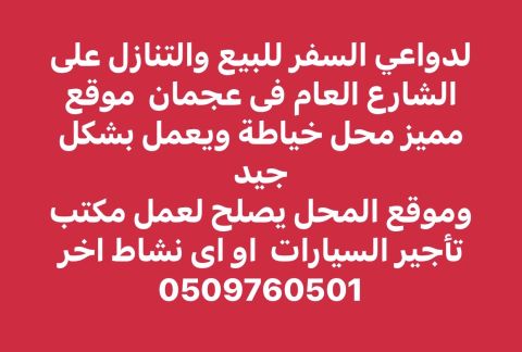 لدواعي السفر للبيع والتنازل على الشارع العام موقع مميز في عجمان محل خياطة ملابس ويعمل بشكل جيد وموقع المحل يصلح لعمل مكتب تأجير سيارات أو أي نشاط آخر والسعر المطلوب 30 ألف درهم
