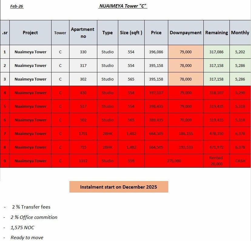 Ready - to - Move - In Studio Luxury studio for sale in Al Naeema Tower C with an open view - Spacious living room - Fully equipped kitchen - Large bathroom - Balcony with an open view - Area 565 SqFt - Down payment AED78000 - monthly installment AED5286 - Remaining balance AED317158 - Total price AED395158 - Studio status Ready to move in or for investment - Private parking space available