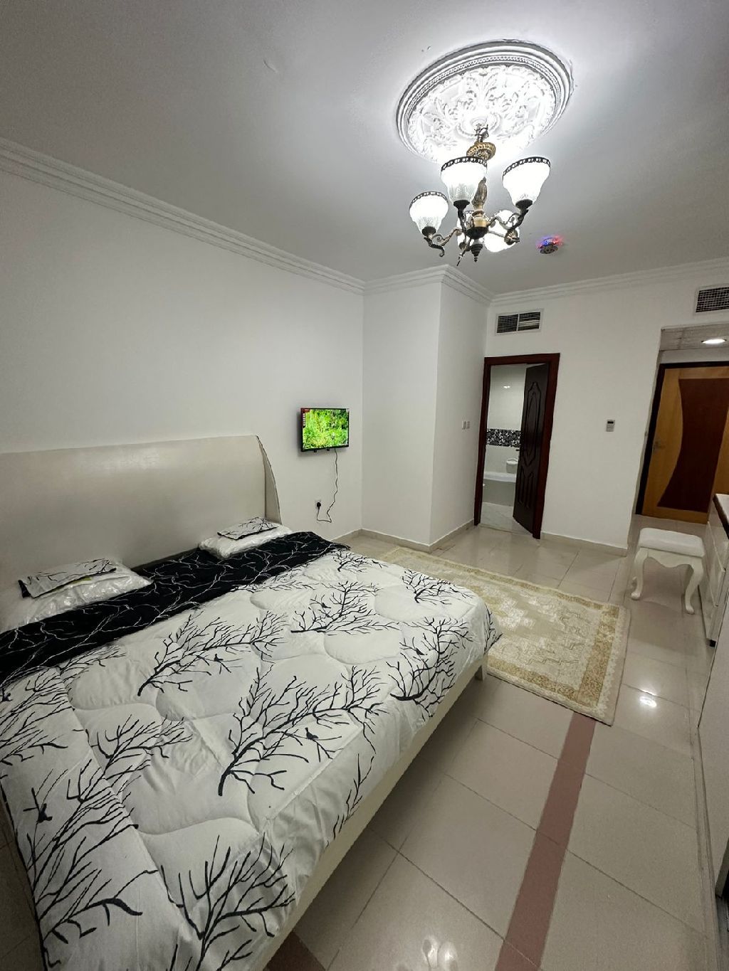 للإيجار الشهري بكورنيش عجمان الرميلة استوديو مساحة كبيرة مفروش فرش نظيف جدا مطبخ شبه منفصل للتواصل