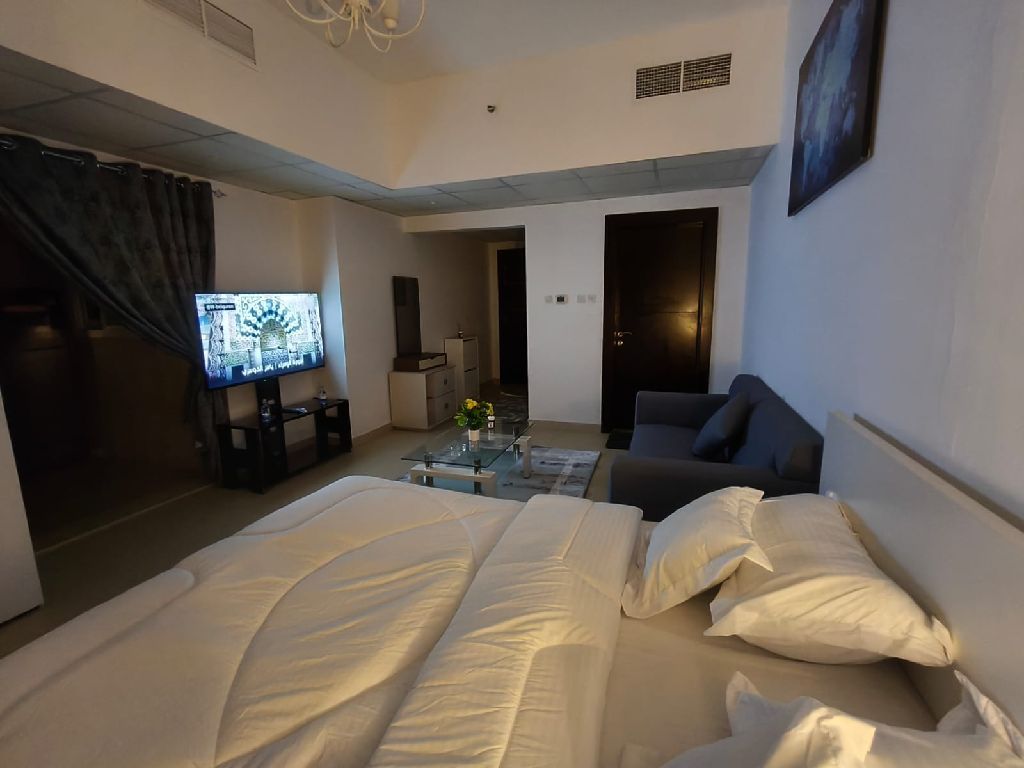 استوديو مفروش للإيجار الشهري في عجمان أول ساكن أبراج الياسمين منطقة الجرف 2 مقابل عجمان سيتي سنتر فرش جديد جدا مطبخ منفصل شامل جميع الاجهزة الكهرباء السعر شامل كل الفواتير والانترنت والباركينج