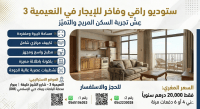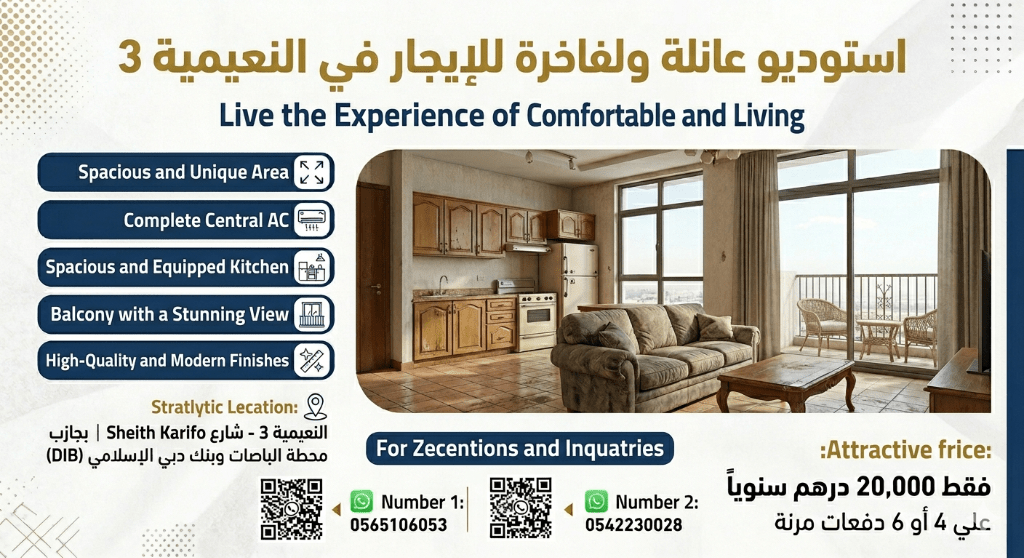 Luxury Studio for rent - Al Al Nuaimia 3 Enjoy a comfortable and premium living experience in a strategic location in Al Al Nuaimia 3 - Sheikh Khalifa Street, close to the bus station and Dubai Islamic Bank. Studio Features Spacious and unique layout Central air conditioning Large fully equipped kitchen Balcony with a nice view Modern high - quality finishing Attractive Price Only AED20000 per year Payable