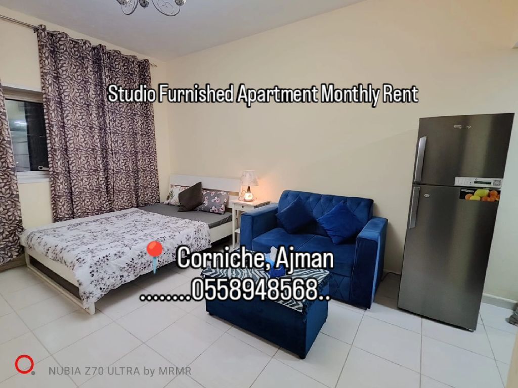 استوديو مفروش للإيجار الشهري إمارة عجمان الكورنيش مباشر مخرج دبي والشارقة بجوار جميع الخدمات والمطاعم والكافيهات ومحطة الباصات شامل جميع الفواتير والانترنت والباركينج ترابي واسع الإيجار 2800 التأمين مسترد عند الخروج 500