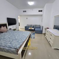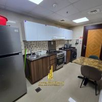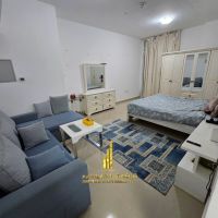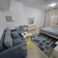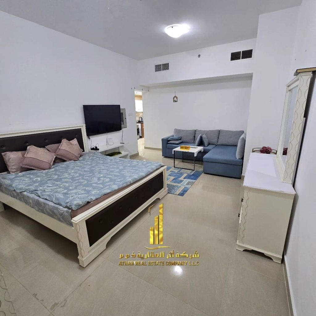 Spacious and with a separate kitchen and balcony, a fully furnished studio for monthly rent in Ajman, Rashidiya 3 area, Khalifa Street, a strategic location next to all services, a very clean tower designated for family housing, the price is 3500, including bills and internet