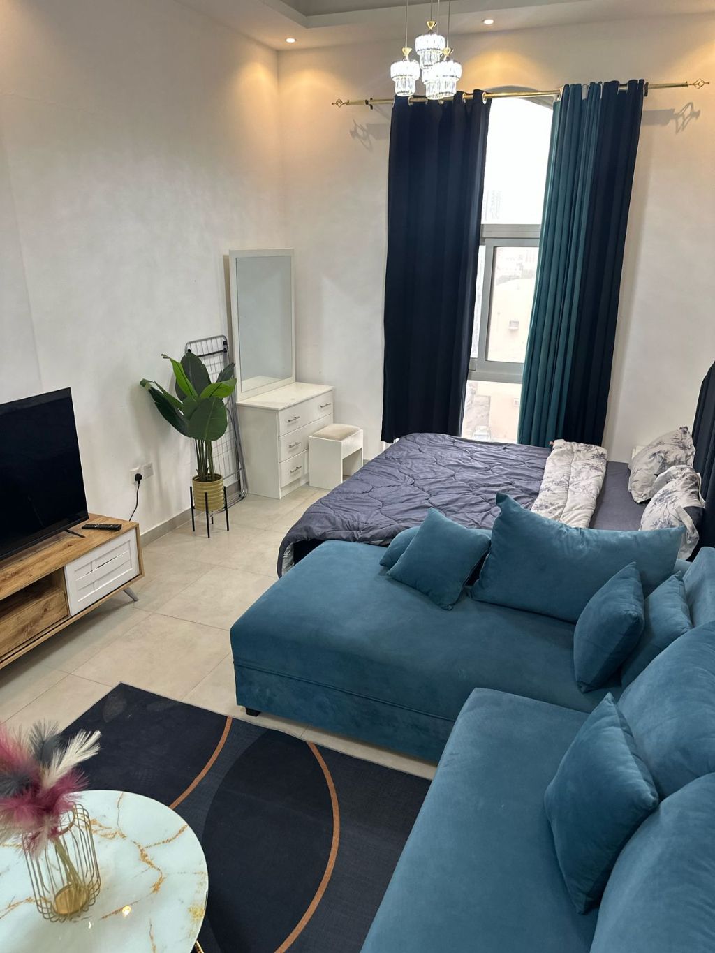 For rent in Ajman, a spacious studio, in a prime location, close to all services, easy access to Dubai and Sharjah, furnished in Al Yasmeen Towers. Studio, separate kitchen, fully furnished, all bills included electricity, water, sewage, internet, and parking inside the tower. Price 3200