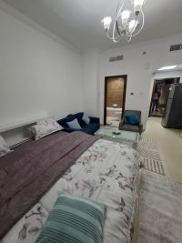 Furnished studio apartment for monthly rent in Ajman, Al Yasmeen Towers, large area, high floor, open view, new, clean, tidy, and sterilized furniture for monthly rent. monthly rent of AED3200, including electricity, water, sewage, internet, and parking. All services, malls, and cafes are available. Close to Sharjah and the Dubai exit