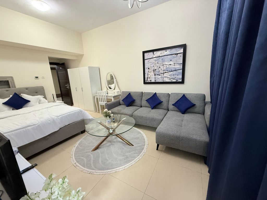 Furnished studio for monthly rent in Yasmin Towers, Al Jerf 2, Ajman. First occupancy with new furniture, spacious layout, separate kitchen, and balcony with open view. Prime location opposite City Centre Ajman, close to all services. Price includes all utilities, internet, and parking