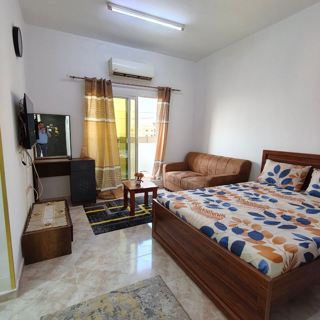 Furnished studio for rent in Rashidiya 1 behind Ramada Black Hotel near Al Mina Street. Excellent location with easy access to malls, shops, health centers, and public transport. Spacious room with balcony overlooking the sea. Separate kitchen with all appliances and external parking. Ready to move in. rent AED3500 monthly including bills and internet