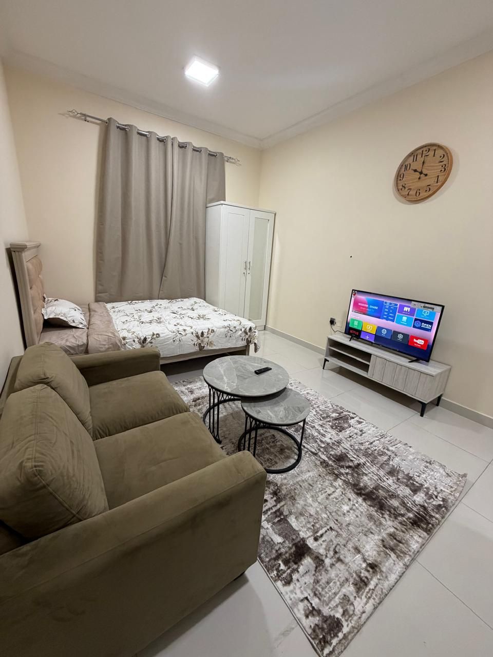 Furnished studio for monthly rent in Ajman Al Al Mwaihat 2 Close to Ajman Academy Near Saudi German Hospital A lively area close to all services Very close to the Sharjah and Dubai exit The rent is 3200, including all bills, internet, new, high - end furniture and an exclusive price