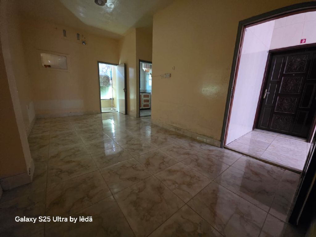 Studio apartment for annual rent, ground floor, in Rashidiya Al Mina Street, a prime location close to all services and amenities. Features include spacious area, balcony, no air conditioning, excellent location, and a very reasonable price