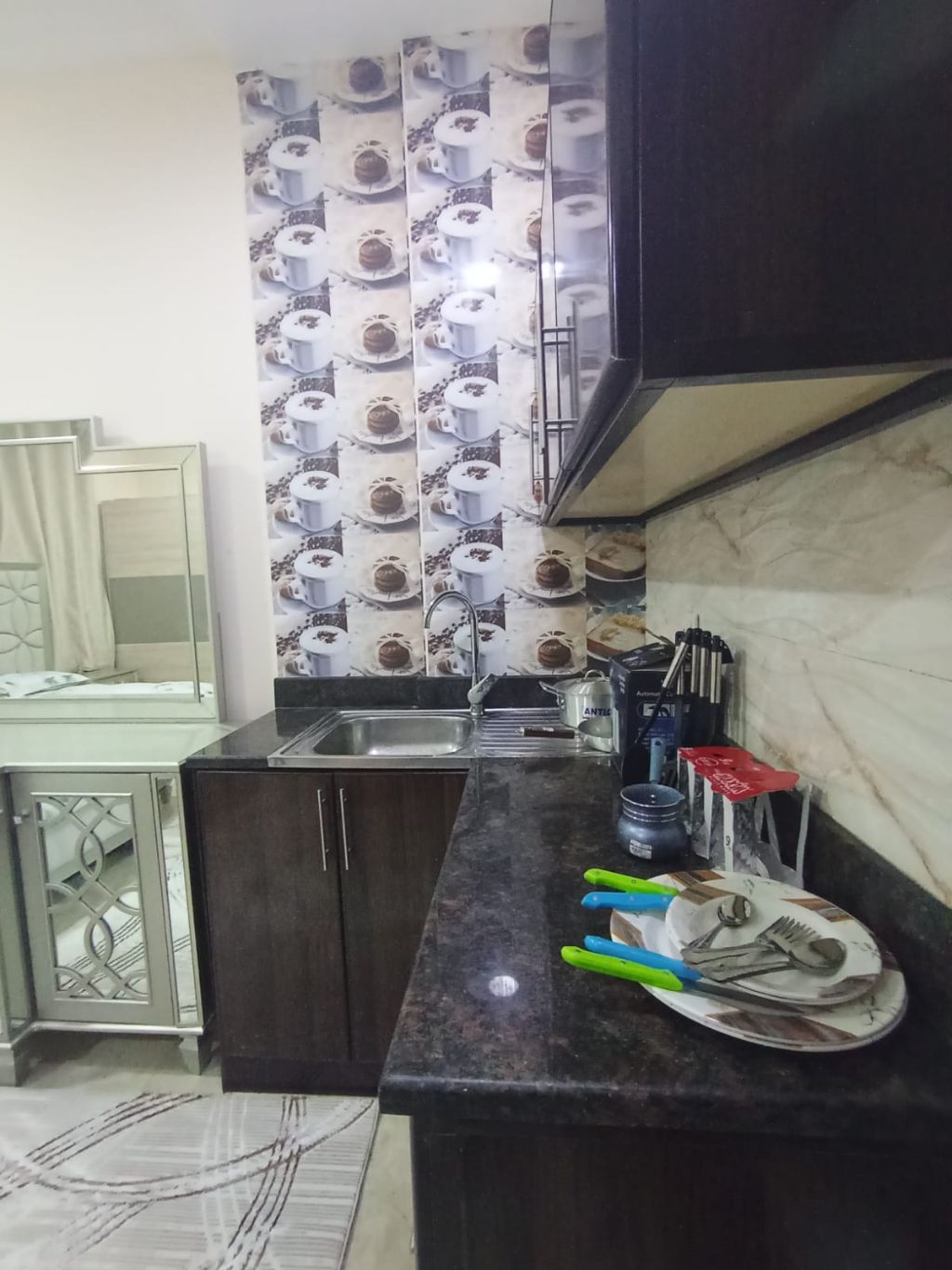 Furnished studio apartment for monthly rent in Ajman Sheikh Ammar Street, direct exit to Dubai and Sharjah Near all services, restaurants, cafes, and bus station Includes all bills, internet, and dirt parking rent AED2800 Deposit AED500, refundable upon departure