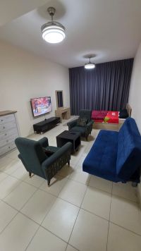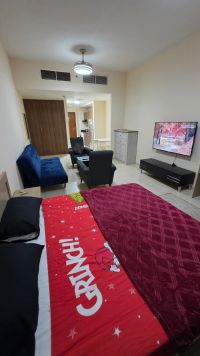 Furnished studio apartment for monthly rent in Ajman One Tower, Rashidiya 3, directly on Verona Roundabout, direct exit to Dubai and Sharjah. Near all services, restaurants, cafes, and bus station. The tower features a gym, swimming pool, garden, and parking. All bills, internet, and dirt parking are included. rent Deposit refundable upon checkout. Available now. Contact via