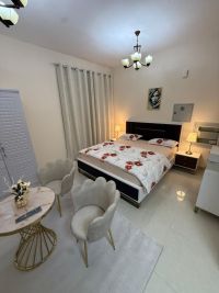 Furnished studio apartment for monthly rent in Ajman Al Jerf 3, opposite the Police Club Direct exit to Dubai and Sharjah on Sheikh Mohammed Bin Zayed City Road Includes all bills, internet, and parking Refundable security deposit of AED500 upon departure