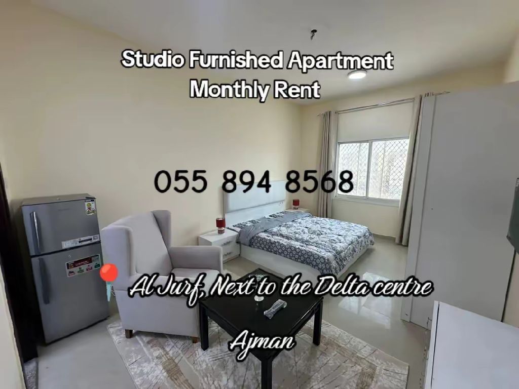 Furnished studio apartment for monthly rent in Ajman Al Jerf, next to Delta Centre Directly on the Dubai and Sharjah exit Near all services, restaurants, cafes, and bus station Includes all bills, internet, and very spacious dirt parking rent Drirhams 2600. Two months cash for Dirhams 5000. and Refundable security deposit of Dirhams 500 upon departure