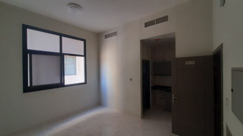A spacious studio apartment for annual rent in Rashidiya 1, Ajman, with a large area, excellent finishes, a separate kitchen, and a split air conditioning and cooling system. It is located on the ground floor in a vibrant and serviced location throughout the day, close to all services such as restaurants, cafes, hospitals, and malls. Periodic maintenance is the responsibility of the owner throughout