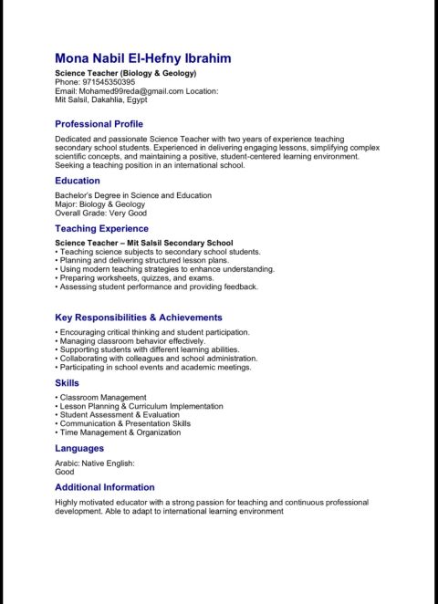 Professional Science Teacher with a Bachelor’s Degree in Science and Education (Biology & Geology) and two years of secondary - level teaching experience. Skilled in lesson planning, classroom management, and delivering engaging, student - centered lessons. Passionate about simplifying scientific concepts, supporting diverse learners, and contributing to a positive international learning environment