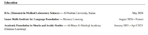 الى سكان عجمان الباحثين عن دعم أكاديمي قوي لأبناءهم، أنا مآب حاصلة على بكالوريوس شرف في علوم المختبرات الطبية وطالبة بمعهد الإمام مالك للتأسيس اللغوي، امتلك خبرة عامين في التدريس المنزلي للفصول المتوسطة في المواد العلوم، الرياضيات، اللغة العربية، التربية الاسلامية. امتلك مهارة التخطيط للدروس والتواصل الفعال وتبسيط المفاهيم واستعمال الأدوات المختلفة لضمان التقدم الأكاديمي. تواصلوا معي