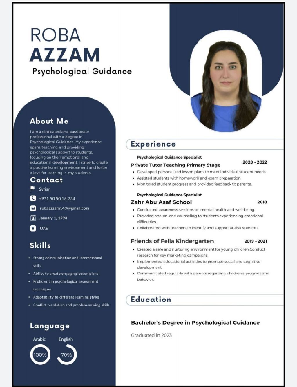 خريجة كلية تربية اختصاص ارشاد نفسي لدي قدرة على متابعة اليومية وتأسيس مرحلة ابتدائية (قراءة - أملاء - كتابة) ودروس خصوصية مكان الإقامة عجمان الراشدية لدي اقامة قابلة للاعارة