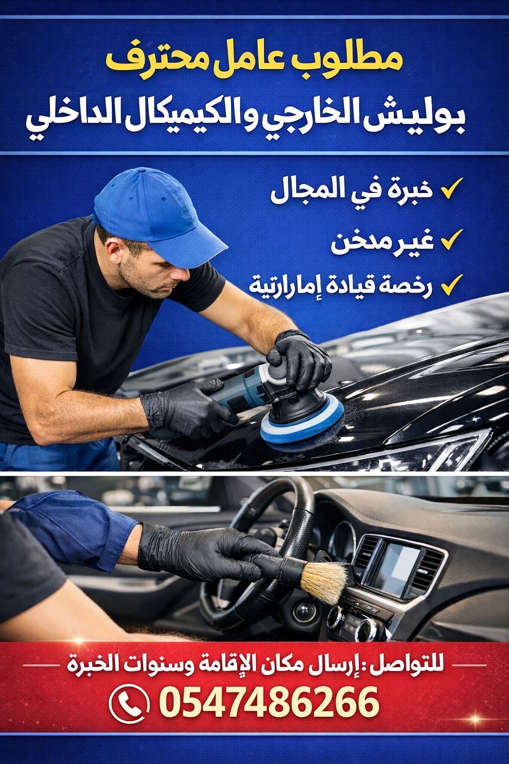 Exterior polisher and interior chemical painter needed. Experience in the field required. Must have a valid driver's license and be a non - smoker. Contact via Ajman - alrawda 3
