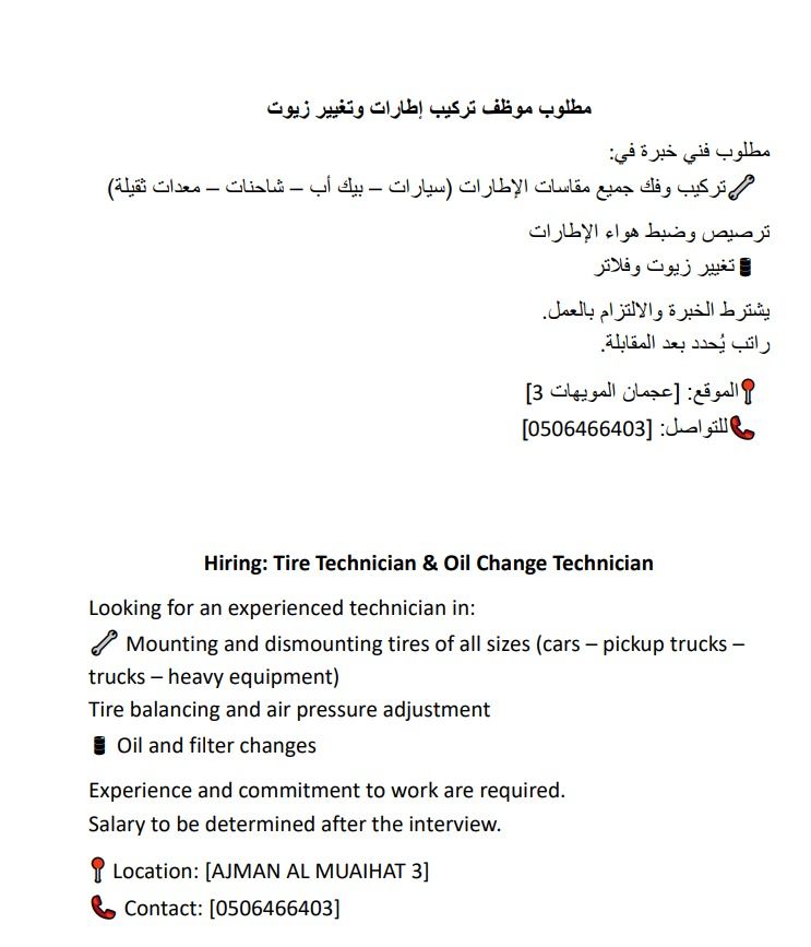 مطلوب خبير فك وتركيب جميع مقاسات الاطارات وتغيير زيت المركبات