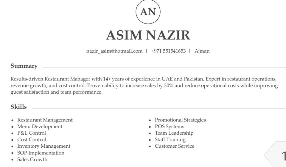 Asim Nazir here, Restaurant Manager based in Ajman with experience in managing dine - inn, cafe Restaurants delivery platforms, staff and daily operations. I am interested in a Restaurant Manager position. Kindly review my CV and let me know if we can connect